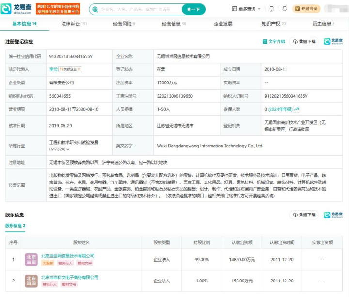 龙易查显示,【无锡当当网信息技术有限公司】成立于2010年8月,法定代表人为李俭,注册资本1.5亿人民币,经营范围包括计算机软件及硬件研发、技术服务及技术培训等,由【北京当当网信息技术有限公司】、【北京当当科文电子商务有限公司】共同持股。