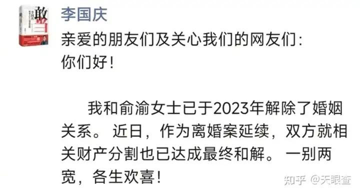 2025年6月,当当网创始人李国庆公布离婚进展,称他已与俞渝就相关财产分割达成最终和解。李国庆当时在朋友圈发文宣布,“我和俞渝女士已于2023年解除了婚姻关系。近日,双方就相关财产分割也已达成最终和解。一别两宽,各生欢喜!”